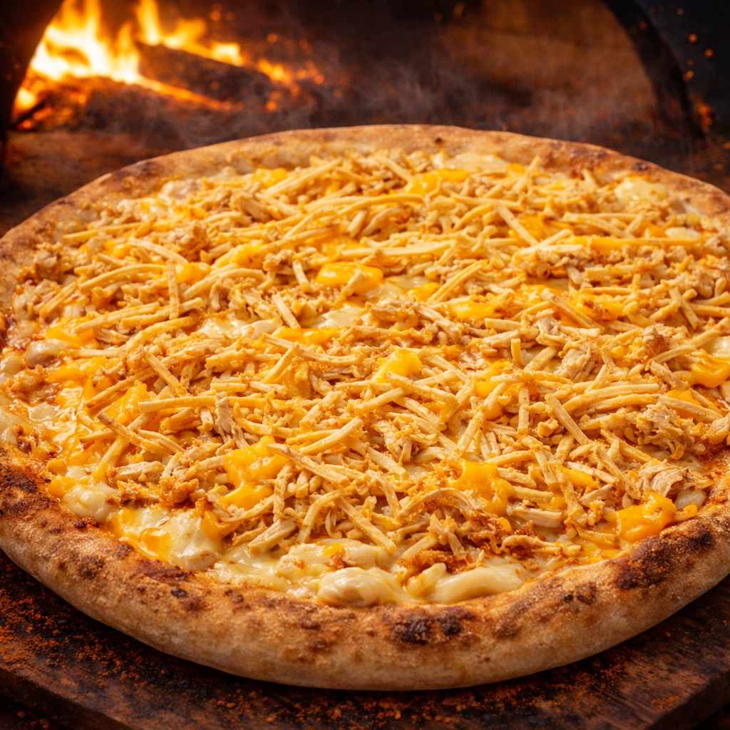 Mussarela, frango desfiado, cheddar e batata palha